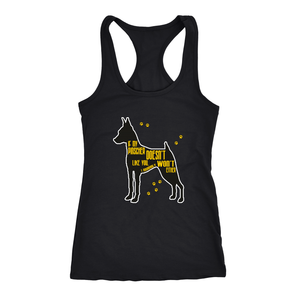 Buy awesome Pinscher clothing for the one you know, the one you love, the one you work with or the one with you are related to! Everyone is going to LOVE this high quality apparel! The quote on the item reads: If my Pinscher doesn't like you, I probably won't either