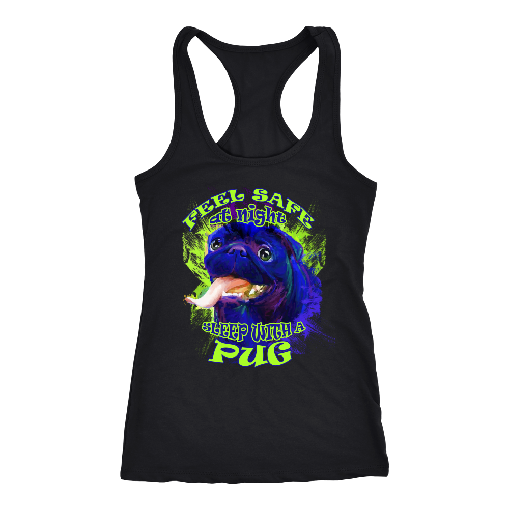 Buy awesome Pug clothing for the one you know, the one you love, the one you work with or the one with you are related to! Everyone is going to LOVE this high quality apparel! The quote on the item reads: Feel safe at night, sleep with a pug