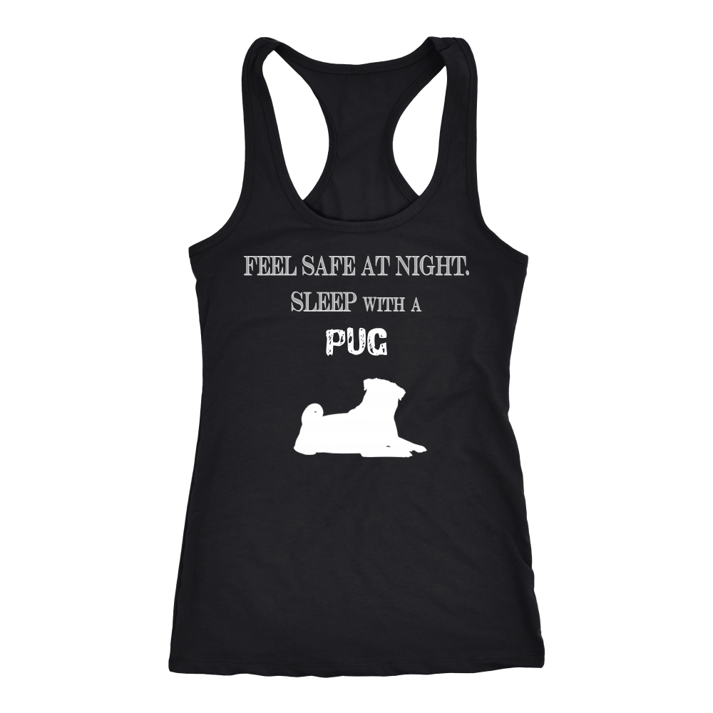 Buy awesome Pug clothing for the one you know, the one you love, the one you work with or the one with you are related to! Everyone is going to LOVE this high quality apparel! The quote on the item reads: Feel Safe At Night. Sleep With A Pug