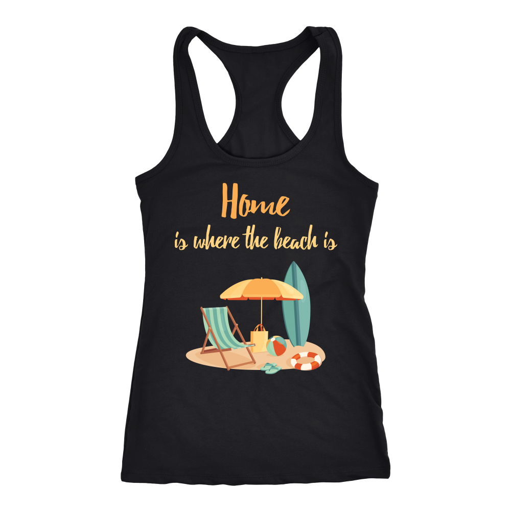 Buy awesome Beach clothing for the one you know, the one you love, the one you work with or the one with you are related to! Everyone is going to LOVE this high quality apparel! The quote on the item reads: Home is where the beach is