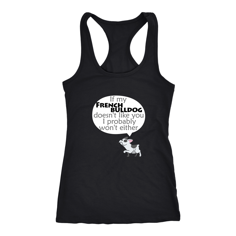 Buy awesome French bulldog clothing for the one you know, the one you love, the one you work with or the one with you are related to! Everyone is going to LOVE this high quality apparel! The quote on the item reads: If my French bulldog doesn't like you I probably won't either