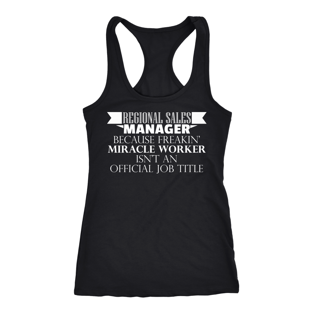 Buy awesome Regional Sales Manager clothing for the one you know, the one you love, the one you work with or the one with you are related to! Everyone is going to LOVE this high quality apparel! The quote on the item reads: Regional Sales Manager because miracle worker isn't an official job title