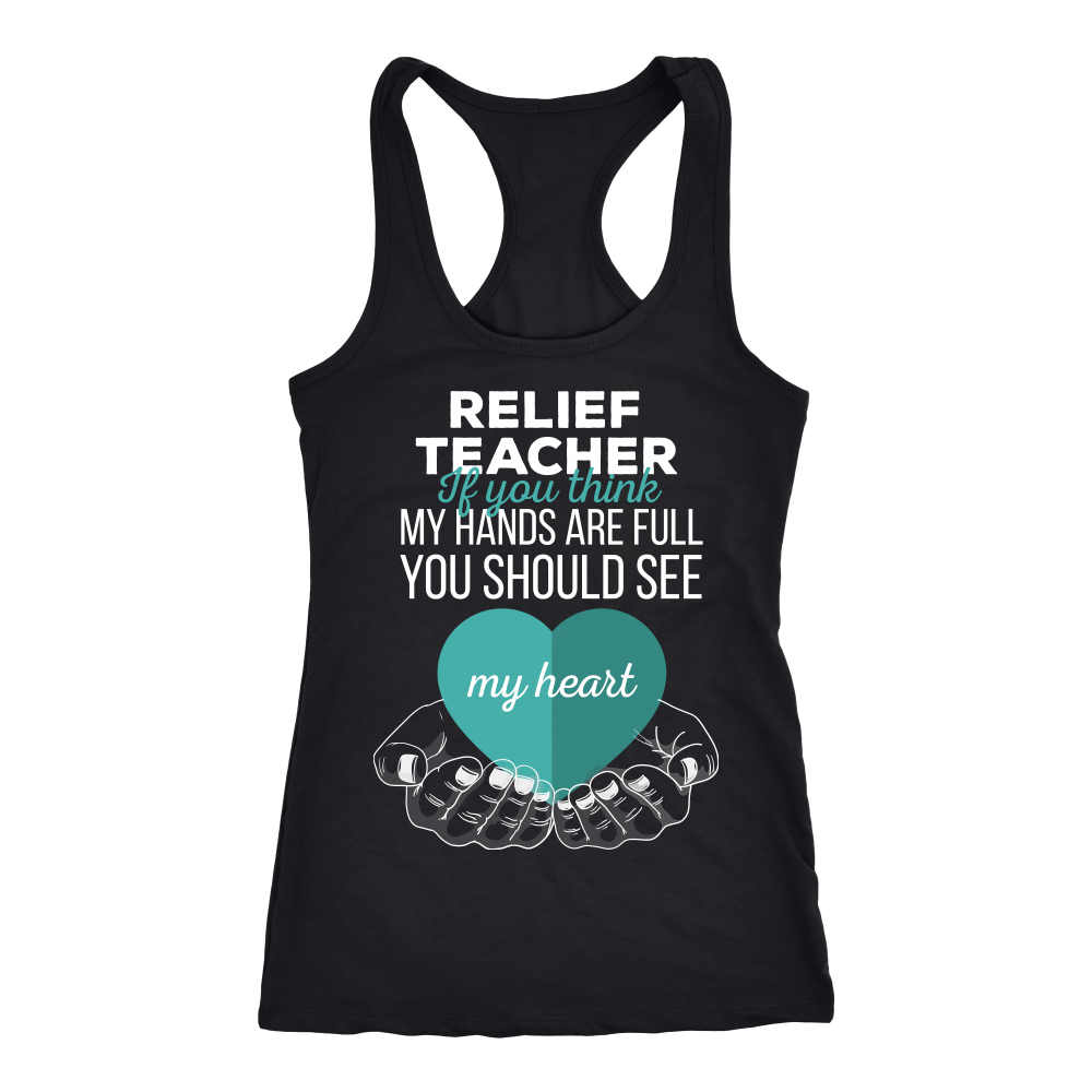 Buy awesome Relief Teacher clothing for the one you know, the one you love, the one you work with or the one with you are related to! Everyone is going to LOVE this high quality apparel! The quote on the item reads: Relief Teacher If you think my hands are full you should see my heart