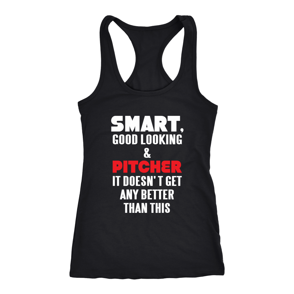 Buy awesome Pitcher clothing for the one you know, the one you love, the one you work with or the one with you are related to! Everyone is going to LOVE this high quality apparel! The quote on the item reads: Smart, good looking and Pitcher. It doesn't get any better than this