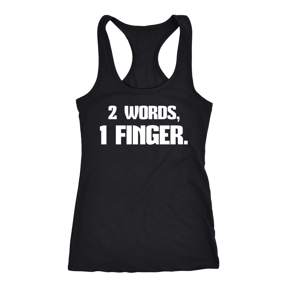 Buy awesome Funny clothing for the one you know, the one you love, the one you work with or the one with you are related to! Everyone is going to LOVE this high quality apparel! The quote on the item reads: 2 Words, 1 Finger.